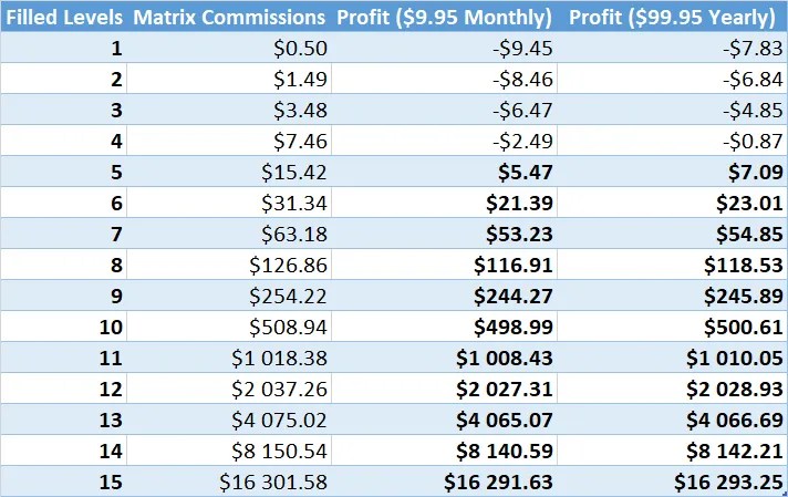 • The matrix structure is 2-wide and 15 levels deep, meaning each position in your downline can only have two direct referrals before the spillover effect places new members in lower levels.